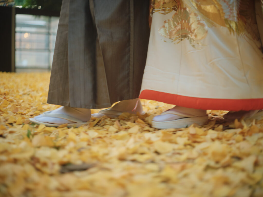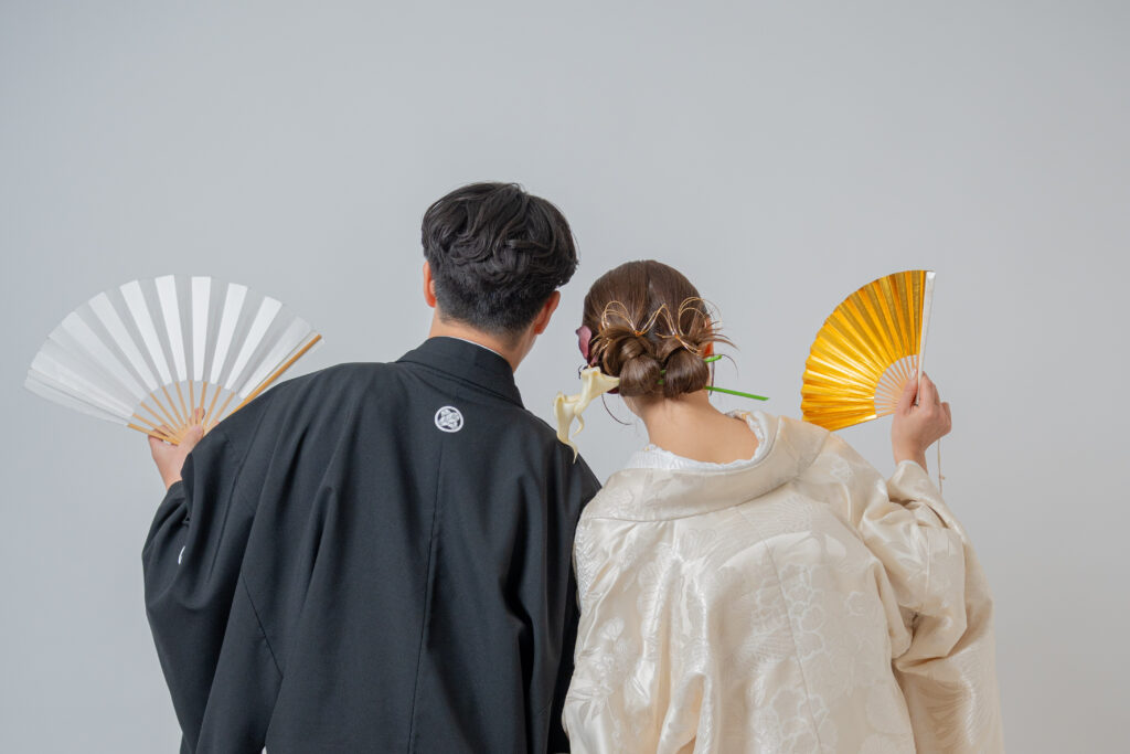 - 後ろ向きショット: 顔を写さず、扇子(末広)やブーケでバランスよく