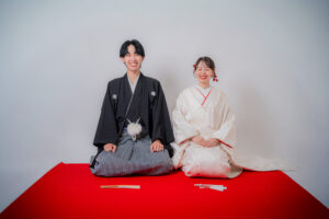 ¥107,800(税込)/全撮影データ約100カット。白無垢 or 色打掛(追加料金なし)+紋付袴、小物一式、新婦ヘアメイク・着付け込み。家族写真無料。スタジオ完結で手堅く“家宝カット”を残したい人に。